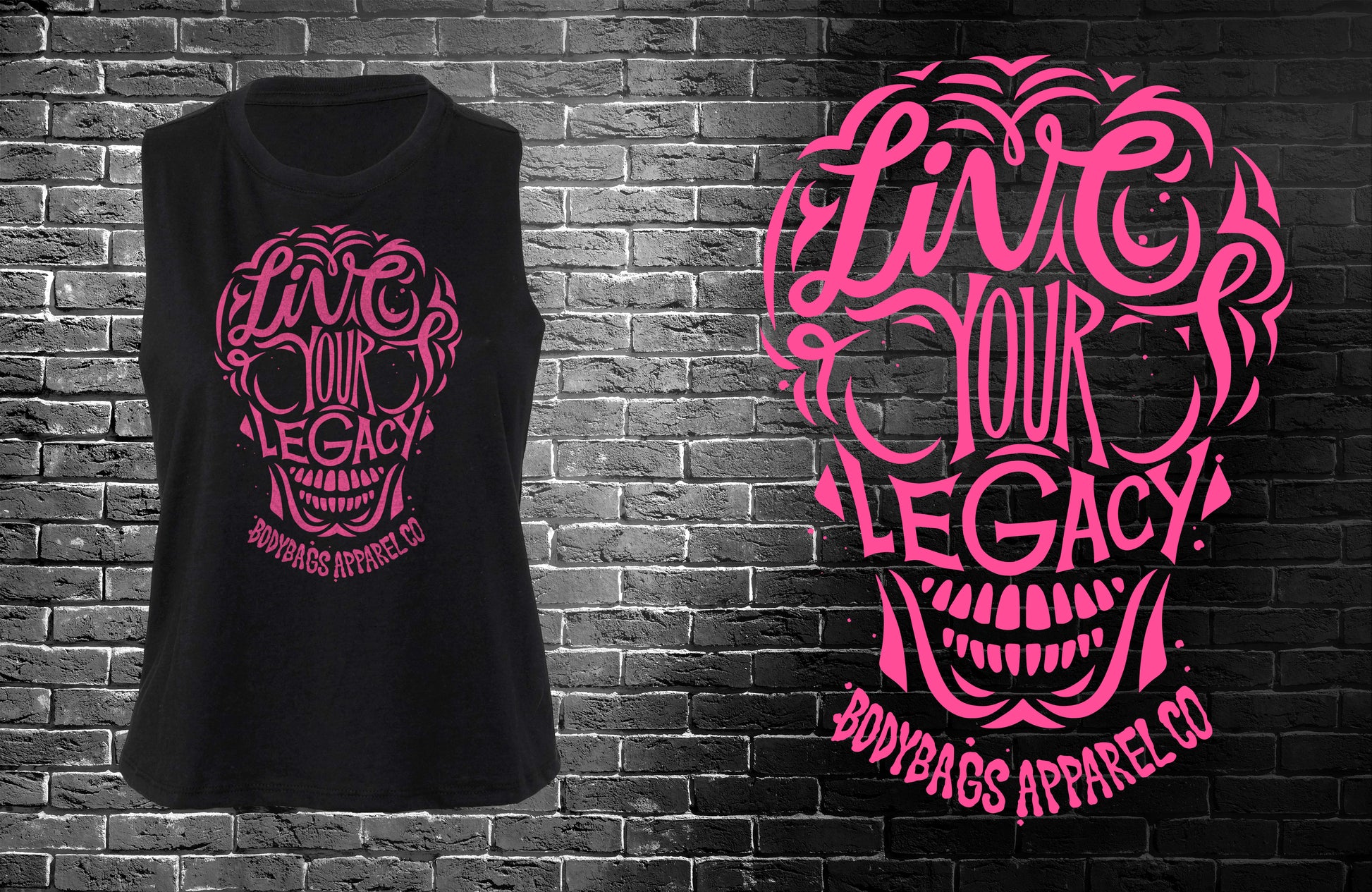 Our Live Your Legacy design is one of our Most popular designs. While we were creating the Original we decided to keep some of our favorite versions and wanted to start sharing them with everyone! Like the Original we wanted to deliver with a badass image with a powerful message. We have always been very into the sugar skull images and wanted a way to combine our look with that of the sugar skull.
